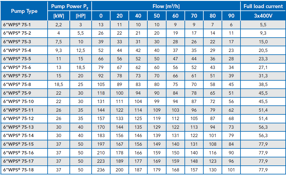 Well Pumps bronpompdeel opgebouwd met Well Pumps motor. Het bronpompdeel en de waaiers zijn volledig uitgevoerd in RVS AISI304. De pomp kan tot maximaal 150 gr/m³ verpompen. De WPS motors zijn watergevuld en geschikt om te gebruiken in combinatie met een frequentieregeling. Standaard voorzien van 1,75 meter kabel. Pompen standaard uitgevoerd met 6" motor, 4" motoraansluiting indien vermeld. Optioneel kan de pomp in RVS AISI 316 geleverd worden. Pomp uitgevoerd met Franklin motor op aanvraag.